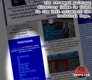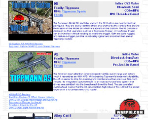 The Paintguns page, a sub-page from the technical page dates back to WARPIG’s birth as a web site hosted on a desktop computer at a university in 1993. Many of the documents linked on that page go back even further, from before WARPIG’s birth to its gestation as a collection of paintball information on an FTP site (File Transfer Protocol – a common way information was hosted and exchanged before the world wide web and HTTP caught on.) In 1995, shortly after WARPIG’s founder, Steve Mitchell turned the project over to its current caretakers, it was relocated to its current address – WARPIG.com. Over the years, the paintguns page has undergone minor formatting changes, most of which merely involved changes to the pages header or addition of international language translations. Now, in 2006, the paintguns page is getting a brand new layout. It is now split into multiple pages, with summary information on each of the listed paintguns, as well as links to related articles both on WARPIG.com and elsewhere on the Internet.