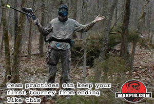There are some important things that your teammates will need to know when you’re on the field, and you’ll want to keep these things in mind. The most important things here are the simplest; you need to tell your teammates where your opponents are on the field, warn them when they’re about to get bunkered, and find out when you need to start laying cover fire. The best way to communicate these things is the original way, good old yell power, but you’ll have to practice them countless times before they are a fluid part of your game. So far we’ve covered some basic things that can make a big difference in your game and help your team do better in a tournament, but that isn’t the most important thing about paintball. Ultimately, win or lose, the most important thing about paintball is having fun; after all, none of us would be playing this if it wasn’t fun. A great way to keep this fun in practice is to include some fun drills just for relaxation. “The Gauntlet” is one such drill, which combines quick movement, quick shooting, and accuracy. It’s a fun break, from scrimmaging and it helps to develop snap shooting skills. The drill is very simple, all you need is some targets (empty soda bottles or old license plates work great) and a field to play on. Set up as many (or as few) targets as you want, behind bunkers, on top of bunkers, wherever, and then practice your shooting skills by running through with your gun, trying to hit as many targets as you can while you run. The idea is very simple, and you can even turn it into a competitive game among your teammates by timing everyone as they go through the course, to see who has the best time and the best score on hitting the targets. You can make the gauntlet more challenging by having your team captain or coach call out specific targets to shoot, like “Sprite!” or “California!” as you run up on a group of targets. This keeps the gauntlet from becoming repetitive and forces the player to keep listening to his or her team-mates while running and shooting. You can see the Ironmen make use of both The Gauntlet and scrimmaging on PigTV here.