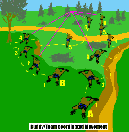 This illustration is based on one from an army training manual. Ok, Ok, I know paintball is not the army, but what it shows is that one team member moves and the other shoots to cover. The team members alternate to allow the covering player to become the moving player. This works with teams of players too you know. There are a couple of special situations