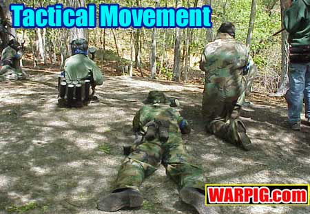 Lets say your group of four players is moving down a trail. Your guys are staggered on either side on the trail moving slowly and quietly. Your are moving to get close to the other side. Maybe you are going after a bunker or just moving to contact. ( meaning your team is trying to find the other team). Well as you move forward, all of a sudden you either take fire, or better yet you see the other players (or player) up ahead. If he hasn't seen you, then the hand signal is given to drop and freeze as you take a bead on the target presented (Seems to always be the facemask.) Anyway, the front player either takes this guy out or decides to let him walk away as long as he has not seen anyone. When the cost is clear the team continues to move. What Normally happens is the guy above sees your team and this is where the practiced tactics come into play. The front guy yells "CONTACT” and starts shooting. All team members also start shooting in the direction of the opposing player. If the unfortunate opposing player is not hit immediately AND is not advancing then your rear team members start rushing forward, all the while the front players are laying down paint. As soon as the rear members have leapfrogged their teammates they start shooting and the Now rear players move up. This continues until the opposing player either wets their pants and takes off running or is hit. What if your team runs into opposing