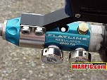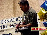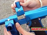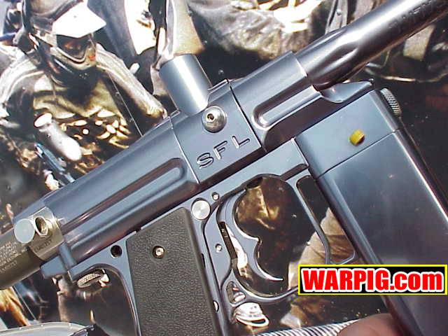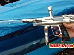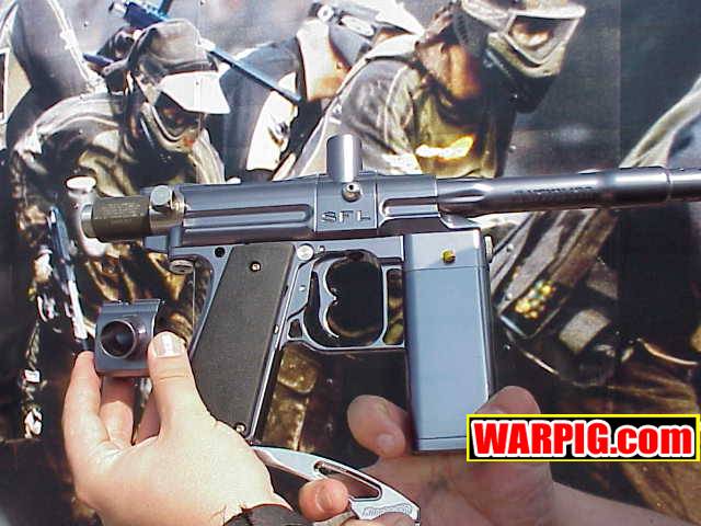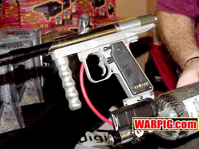 AGD President Tom Kaye introduced the new Intelliframe for the Automag.  The Intelliframe fits standard mechanical Automags (classic, minimag, RT Pro, etc.) and from the outside looks like a typical aftermarket two finger 45 style frame.  Internally it features mount points to hold a microswitch that will be tripped every time the trigger is pulled.  This allows the use or Intellifeed, Warp Feed, or other loader systems which need an electronic signal from the paintgun to activate.  The long awaited 4500 psi Flatline compressed air system was shown in a pre production version, with production models expected to ship in the next few months.  Likely the hottest head turner was the new aluminum body for the E-Mag.  The new body gives the E-Mag a look that is more in line with modern high end paintguns, and offers metal that can be milled and anodized for custom versions.  A replaceable breech allows for center feed or left side feed for use with a Warp Feed (or to hold the paintgun sideways "gangsta" style :-).  Autococker threaded barrels lock the breech in place, and a pair of openings allow for a ball bearing style ball detent, and the possible future installation of an anti-chop eye.  The first in line for the customizers was Bad Boyz Toyz.  A prototype Shocktech SFL (Super F$*%&@% Light) E-Mag designed by Danny Love was shown in the BBT/Shocktech booth.