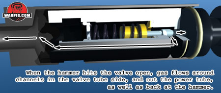 The hammer presses on the pin, which pushes the valve seal away from its seat, and compresses the valve spring. This allows gas which feeds into the valve to be released in two directions. A portion of the gas flows around the sides of the valve, through channels in the inner aluminum valve tube, around to the front of the valve body, into the power tube, and ultimately through the bolt, firing the paintball. A screw protrudes through the side of the valve body, partially blocking the flow of gas into the power tube. The head of this screw is accessible a hole in the right side of the BT-16’s receiver. Screwing the adjuster inward blocks more gas flow, reducing velocity, while screwing it outward blocks less flow, increasing velocity.