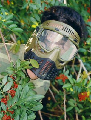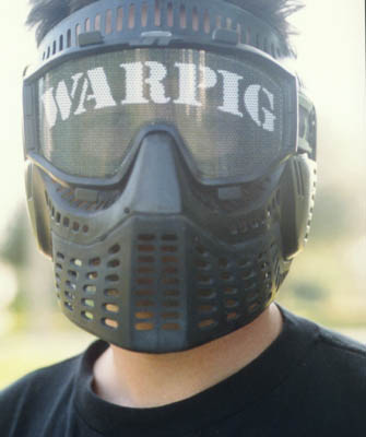 Goggle Skinz are billed as "one way goggle camouflage". They are basically a sticker that goes over the goggle lens, and is perforated with a lot of tiny holes, making it into a screen. From the inside, they work like a slightly tinted lens. Surprisingly they are not even as dark as most "smoke" tinted paintball goggle lenses. If you concentrate on it, you can see a pattern of blurry dark dots caused by the screening. However, after wearing the Goggle Skinz for only a minute or so, the brain cancels out the dots, and there is no noticeable effect on vision. From the outside, things look entirely different. When the goggle is held up in the open, it can be seen through, but on a person's face, without a light source behind it, all that is seen is the graphic on the Skinz (in the pictures here, you can see through it a bit, due to the camera flash).