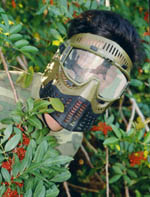 Disguising your lens with Skinz is easy - if you're wearing a JT or Scott goggle. Unfortunately, the heavy curvature of the Brass Eagle Extreme Vision goggles means they won't work with Goggle Skinz. Installation starts by cleaning the lens thoroughly, as per the manufacturer's instructions. Cleanliness is not only next to godliness, it means the Skinz will stick. The Skinz peel off of their protective backing, and are easily smoothed onto the lens. Viola! you're done. Meticulous cleaning is important. With the Skinz in place, a simple wipe is not enough to clear a lens, it needs to be thoroughly rinsed. The materials in paintball fill degrade the strength of the polycarbonate used in goggle lenses, so cleaning at the end of the day is critical. Remember too, that goggle manufacturers recommend changing a lens after any direct hit - not because they are in the business of selling lenses, but because the stress cracks caused by a hit are invisible to the naked eye (they are very easy to see with a polarized lens).